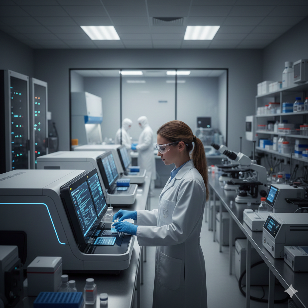 بخش توالییابی (Sequencing Unit): مجهز به دستگاههای پیشرفتهای چون سیکوئنسر نسل جدید (NGS). این دستگاهها قادرند ترتیب دقیق نوکلئوتیدها (A, T, C, G) در یک ژن یا کل ژنوم را با سرعت و دقت بیسابقه تعیین کنند.