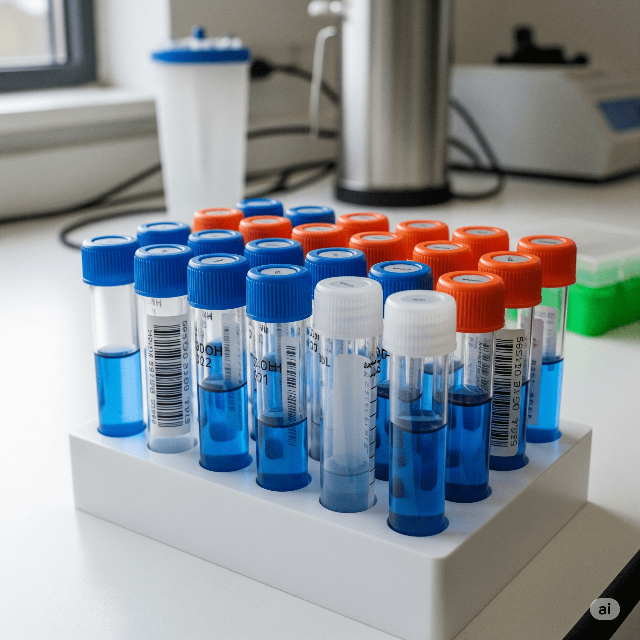 ۱. درپوش پیچی (Screw Cap): رایجترین نوع که آببندی مطمئنی را فراهم میکند و از نشت نمونه جلوگیری میکند. این درپوشها برای نگهداری طولانیمدت و سانتریفیوژ ضروری هستند.